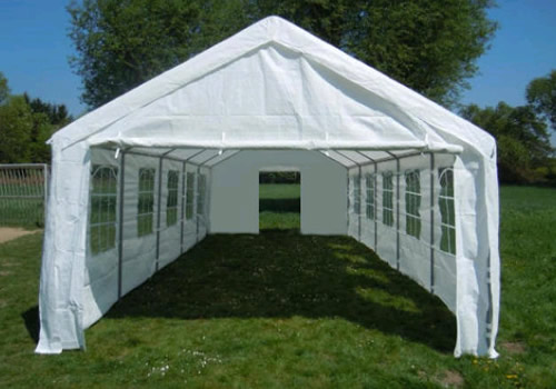 Stabiles Stecksystem mit PE Planen, Sprossenfenstern und 2 Eingängen.