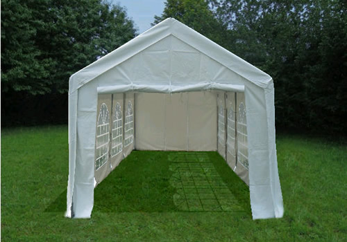 Stabiles Stecksystem mit PE Planen, Sprossenfenstern und 2 Eingängen.
