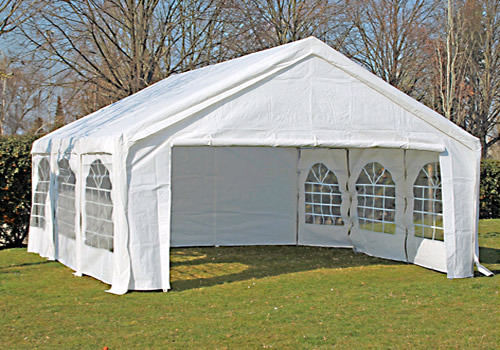 Stabiles Stecksystem mit PE Planen, Sprossenfenstern und 2 Eingängen.